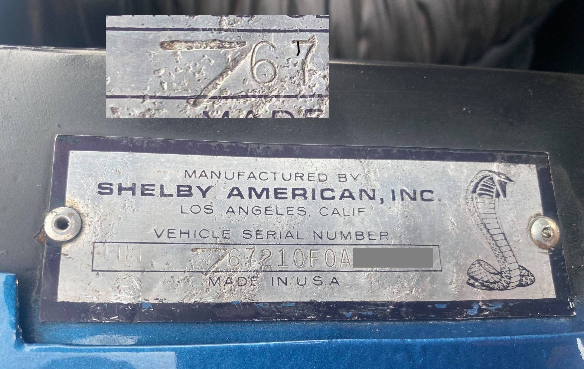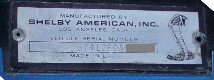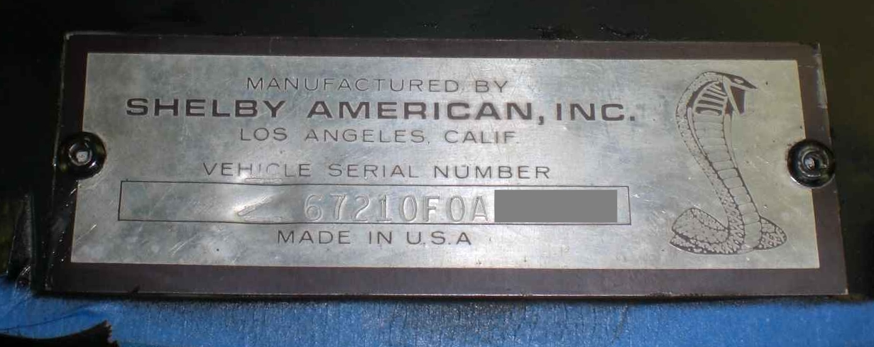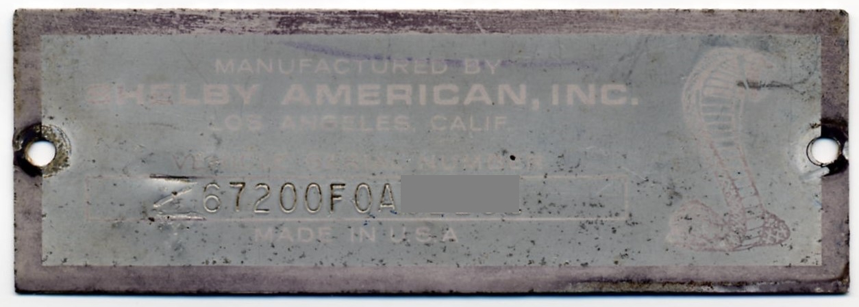 The Z prefix added to Shelby VIN plates appears to have started with cars 'completed' by Shelby American from April 27, 1967 through the end of '67 model year production. It appears that the added 'Z' on some cars' VIN plates may have been formed by multiple strikes of a flatblade screwdriver, possibly indicating that the regular stamp was misplaced for a few days. As of January 2026, the SRG has cataloged a total of 11 cars that wear a VIN plate with an improvised Z. All of them are painted either Red or Acapulco Blue. Note: The regular 'Z' stamp character font appears to be taken from the kit (same height) used for the secondary Shelby VIN that was stamped to the passenger side apron next to the shock tower. Greg Kolasa's observation.
