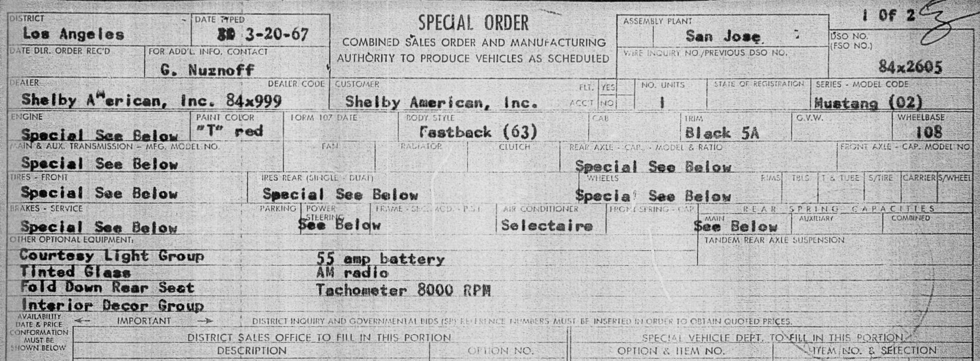 At the start of '67 model year production, the RPO battery for all Mustangs, including the Mustang-based Shelby GT, was the Group 22 45A battery. The exception was cars equipped with the FE big block mated to a C-6 automatic transmission. For '67 the FE included the 390 CID, and, in the case of a Shelby GT 500 unit, the 428-8V Special Interceptor. Dimensionally, both batteries share the same height of 8.95". The Group 22 is 9.42" long and weighs 30 lbs, while the Group 24 is 10.75" long and weighs 34 lbs. The Heavy-Duty (HD) battery option is indicated by a value of "1" in column 63 of the 80-column Ford Computer Record (FCR). The FCR can be found atop a Deluxe Marti Report. The HD (Group 24F, 55Ah) battery was included as standard equipment on Mustangs equipped with the FE 390 and an automatic transmission. When included as standard equipment, Column 63 would not have a value of "1" despite the car receiving the Group 24 55Ah HD battery. The Shelby GT 500 units with 428-8V Special Interceptor and C6 automatic transmission followed suit, and would have automatically received the G24 55Ah HD battery (and Column 63 of the computer record would have been blank). Beginning with DSO 2579, all Shelby GT 350 and GT 500 4-speed units were specifically requisitioned with the "55Ah Battery" on this special order forms (it wasn't requested on GT500+auto for the reason stated above).